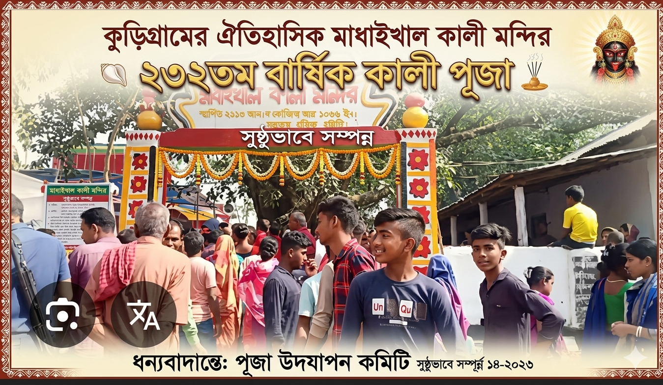 কুড়িগ্রামের ঐতিহাসিক মাদাইখাল কালী মন্দিরে ২৩২ তম কালীপুজা-২০২৬ সুষ্ঠুভাবে সম্পন্ন