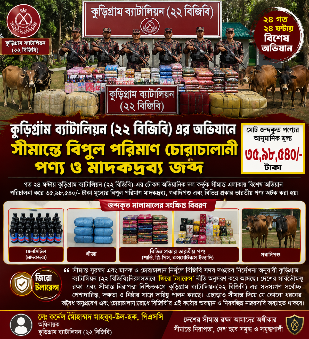 কুড়িগ্রামে সীমান্ত এলাকায় বিশেষ অভিযানে বিপুল পরিমাণ চোরাচালান পণ্য ও মাদকদ্রব্য জব্দ