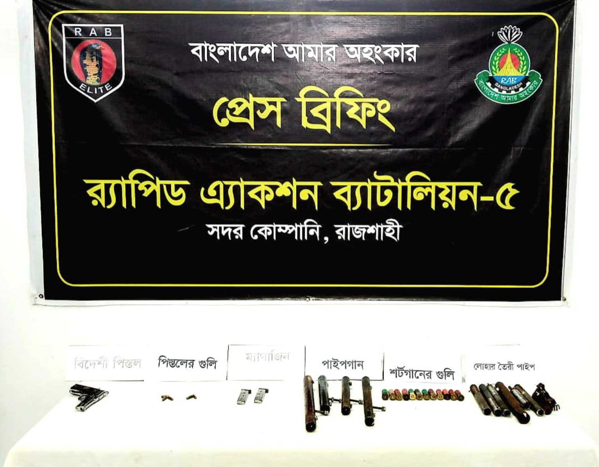দেশজুড়ে আইনশৃঙ্খলা পরিস্থিতি স্বাভাবিক রাখা এবং সন্ত্রাস ও অবৈধ অস্ত্রের বিস্তার রোধে ধারাবাহিক অভিযানের অংশ হিসেবে রাজশাহীর তানোর উপজেলায় টানা অভিযান চালিয়ে একটি বিদেশি পিস্তলসহ বিপুল পরিমাণ অবৈধ অস্ত্র ও গোলাবারুদ উদ্ধার করেছে র্যাপিড অ্যাকশন ব্যাটালিয়ন (র্যাব)-৫।