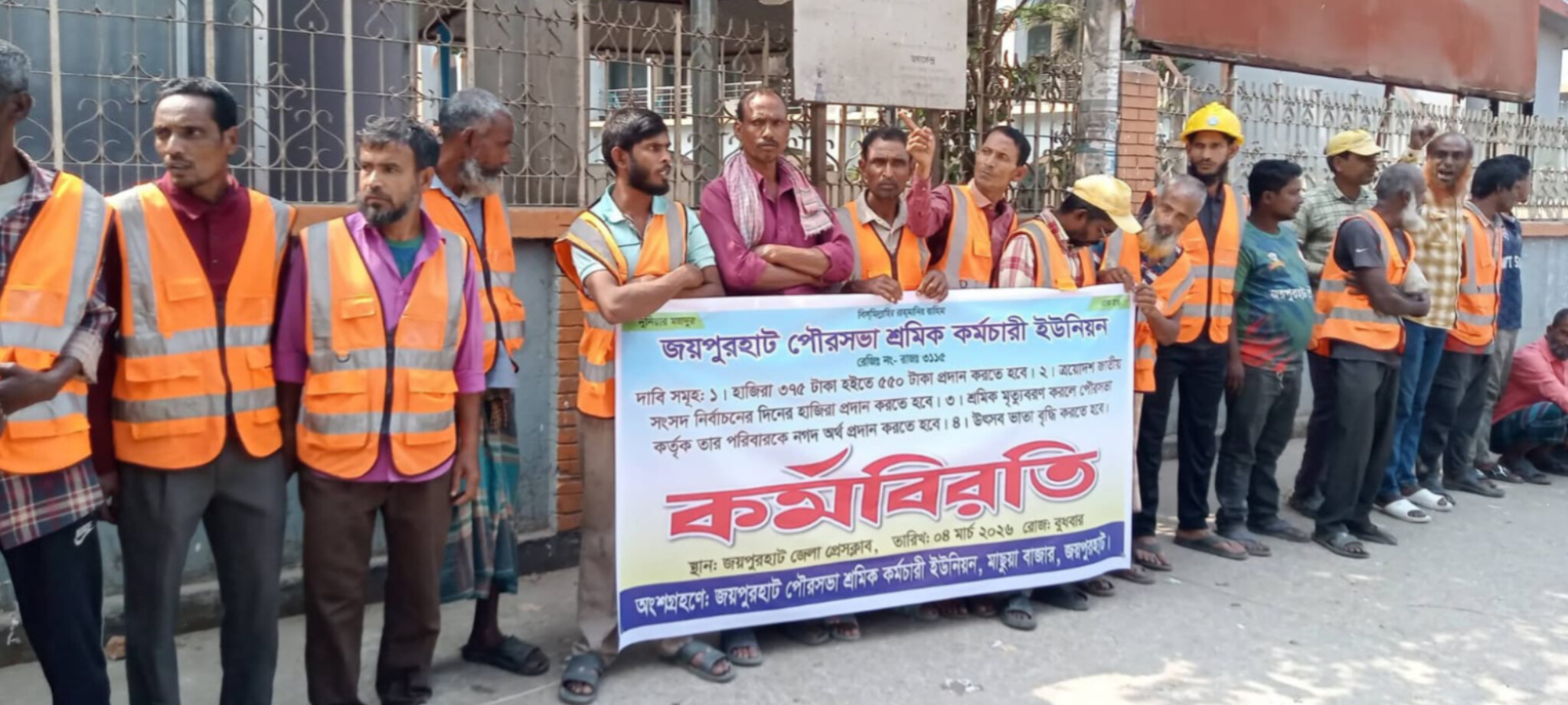 জয়পুরহাট পৌরসভার শ্রমিক-কর্মচারীরা চার দফা দাবিতে অনির্দিষ্টকালের জন্য কর্মবিরতি পালন করছেন। বুধবার (৪ মার্চ ২০২৬) সকাল থেকে তারা পৌরসভার সামনে অবস্থান নিয়েছেন। এতে পৌরসভার বিভিন্ন শাখার দৈনিক মজুরি ভিত্তিক শ্রমিক ও কর্মচারীরা অংশ নেন। অনেকেই সড়কের উপর শুয়ে দিয়ে প্রতিবাদ জানান।