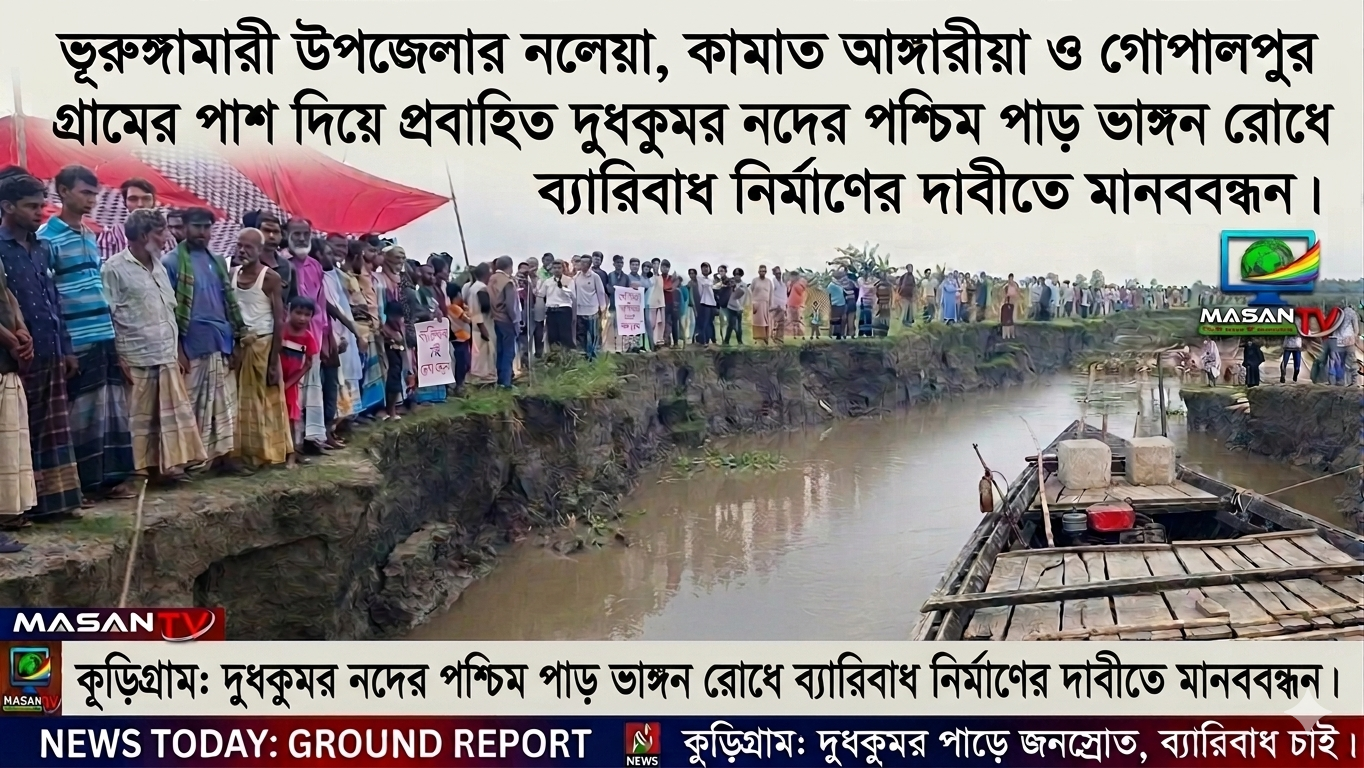কুড়িগ্রামের ভূরুঙ্গামারী উপজেলার কামাত আঙ্গারিয়া ও নলেয়া মৌজা দিয়ে প্রবাহিত দুধকুমর নদের ভয়াবহ ভাঙন রোধে মানববন্ধন ও প্রতিবাদ সমাবেশ অনুষ্ঠিত হয়েছে। নদীর গুরুত্বপূর্ণ অংশে বাঁধ নির্মাণ আংশিকভাবে বন্ধ রেখে উজান ও ভাটির অংশে কাজ সম্পন্ন করায় এই এলাকায় ভাঙন মারাত্মক আকার ধারণ করেছে বলে অভিযোগ করেছেন স্থানীয়রা।