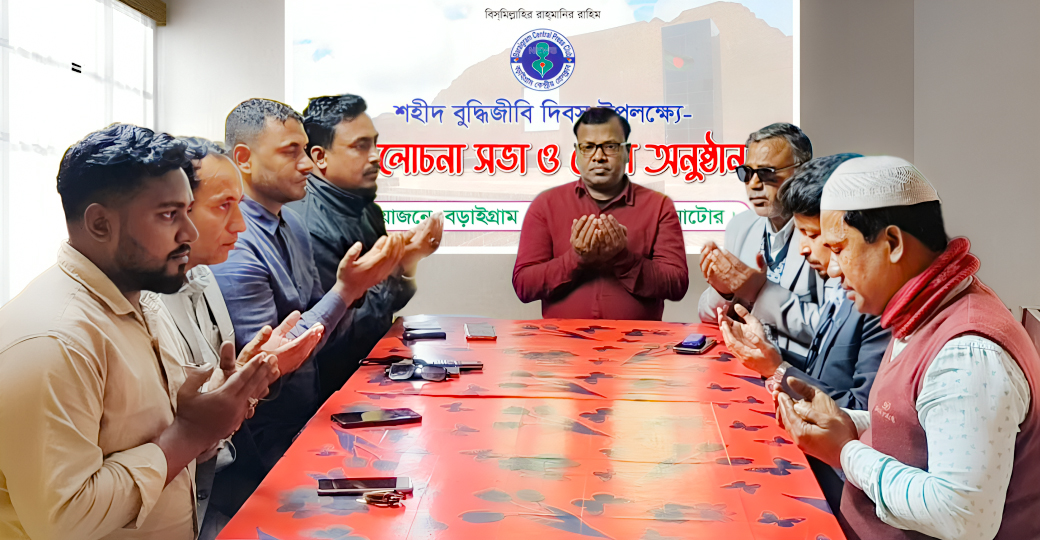 নাটোরের ‘বড়াইগ্রাম কেন্দ্রীয় প্রেসক্লাব’ এর উদ্যোগে শহীদ বুদ্ধিজীবী দিবস পালিত হয়েছে। রবিবার (১৪ ডিসেম্বর) সকালে প্রেসক্লাবের নিজস্ব কার্যালয়ে এ উপলক্ষে আলোচনা সভা ও দোয়া অনুষ্ঠিত হয়।