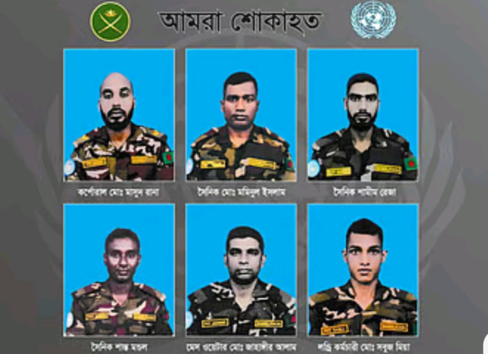 শহীদ শান্তিরক্ষীরা হলেন— কর্পোরাল মো. মাসুদ রানা, এএসসি (নাটোর), সৈনিক মো. মমিনুল ইসলাম, বীর (কুড়িগ্রাম), সৈনিক শামীম রেজা, বীর (রাজবাড়ি), সৈনিক শান্ত মন্ডল, বীর (কুড়িগ্রাম), মেস ওয়েটার মোহাম্মদ জাহাঙ্গীর আলম (কিশোরগঞ্জ) এবং লন্ড্রি কর্মচারী মো. সবুজ মিয়া (গাইবান্ধা)।