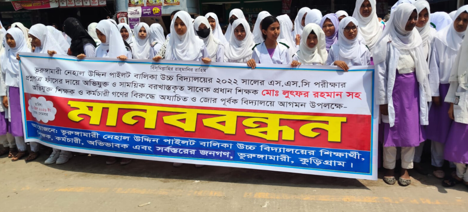 ভুরুঙ্গামারীতে এসএসসি প্রশ্নপত্র ফাঁসে জড়িত শিক্ষকদের পুনর্বহাল না করার দাবিতে মানববন্ধন অনুষ্ঠিত।