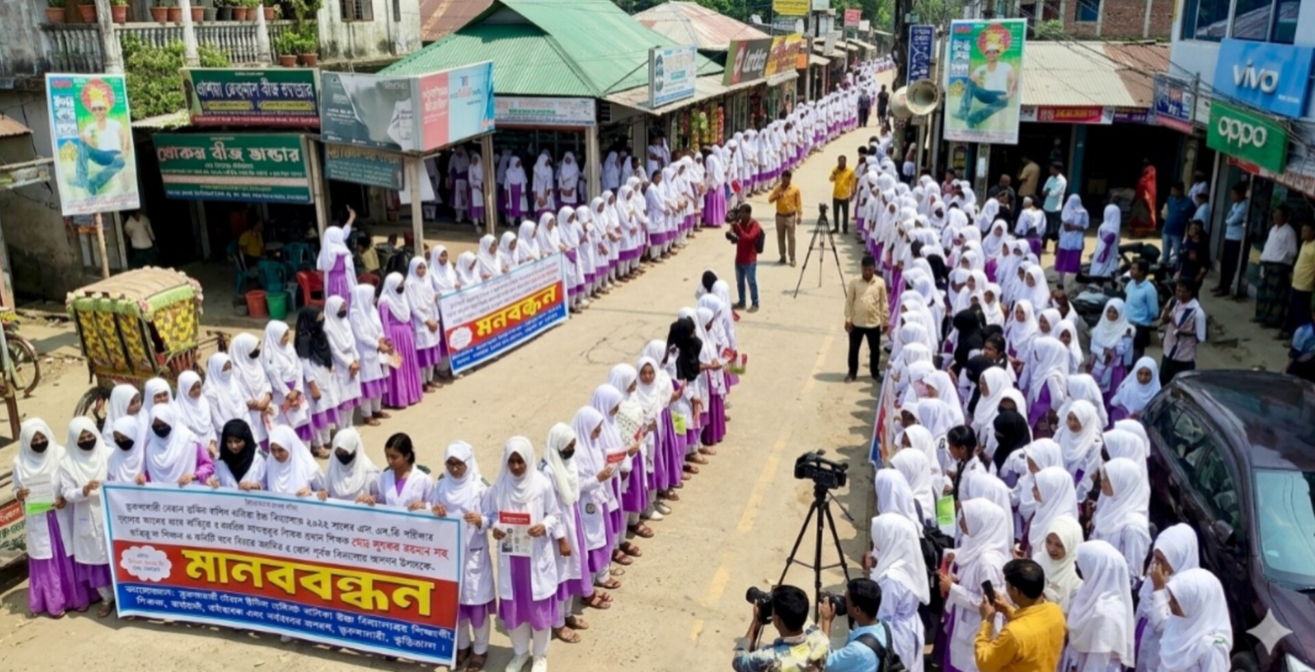 ভূরুঙ্গামারীতে এসএসসি পরীক্ষার প্রশ্নপত্র ফাঁসের সাথে জড়িত শিক্ষকদের পুনর্বহাল না করার দাবিতে মানববন্ধন