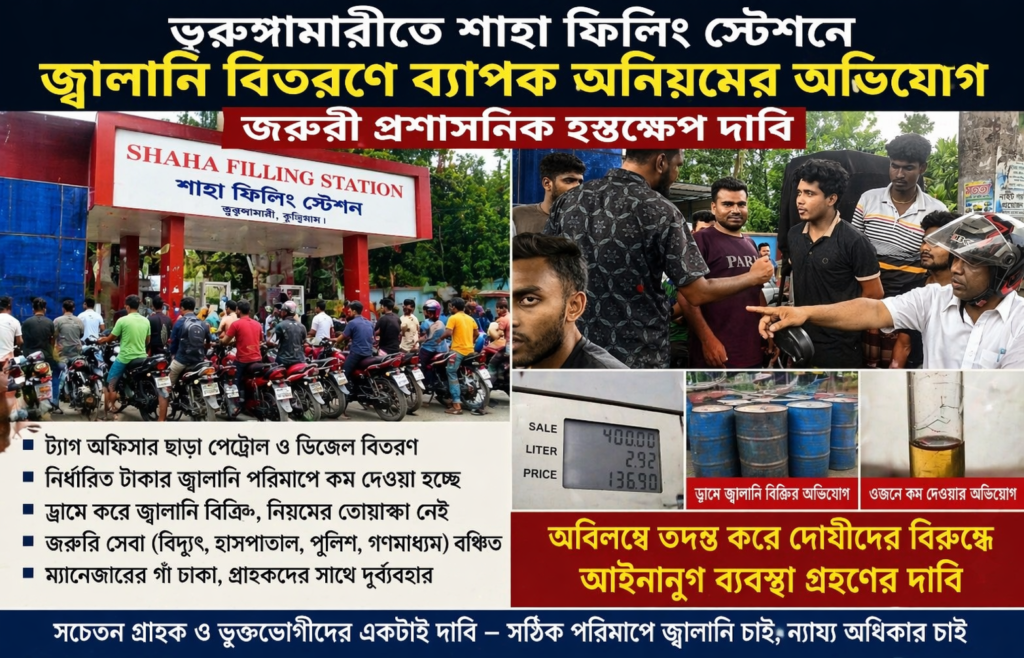 ভুরুঙ্গামারীতে শাহা ফিলিং স্টেশনে জ্বালানি বিতরণে ব্যাপক অনিয়মের অভিযোগ, জরুরি প্রশাসনিক হস্তক্ষেপ দাবি