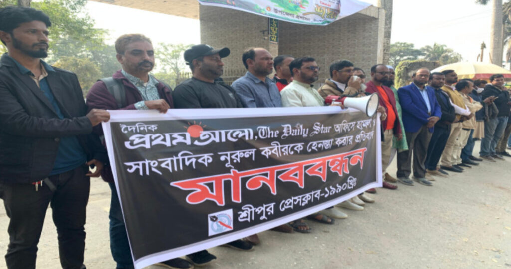 প্রথম আলো ও ডেইলি স্টার অফিসে হামলার প্রতিবাদে শ্রীপুরে সাংবাদিকদের মানববন্ধন