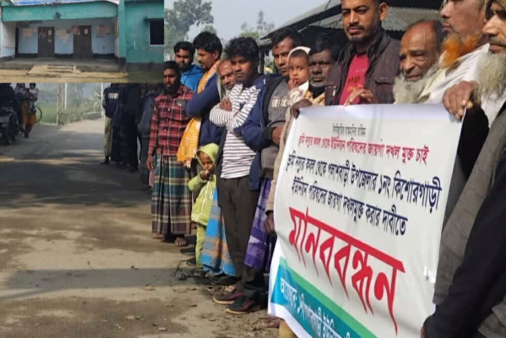 পলাশবাড়ীতে ইউনিয়ন পরিষদের জমি দখলমুক্ত করার দাবিতে মানববন্ধন